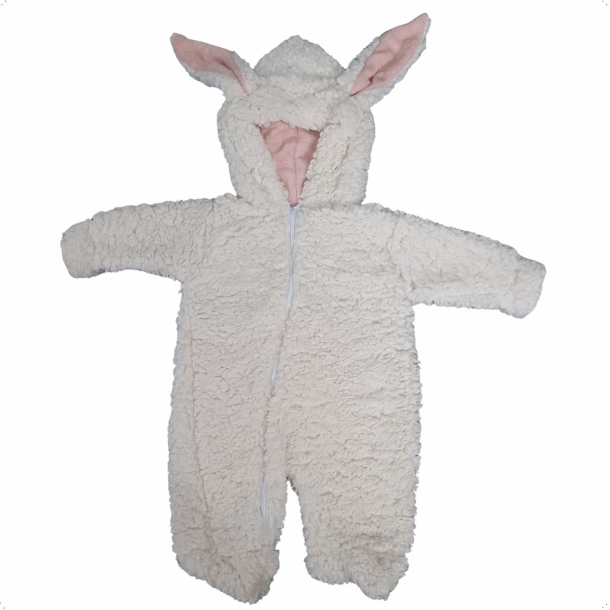 Com design delicado de coelhinho, o macacão chama atenção pelo visual encantador e pelas orelhinhas no capuz. O tecido sherpa oferece um toque extremamente macio e quentinho, enquanto o zíper frontal facilita na hora de vestir e trocar, trazendo praticidade no dia a dia.